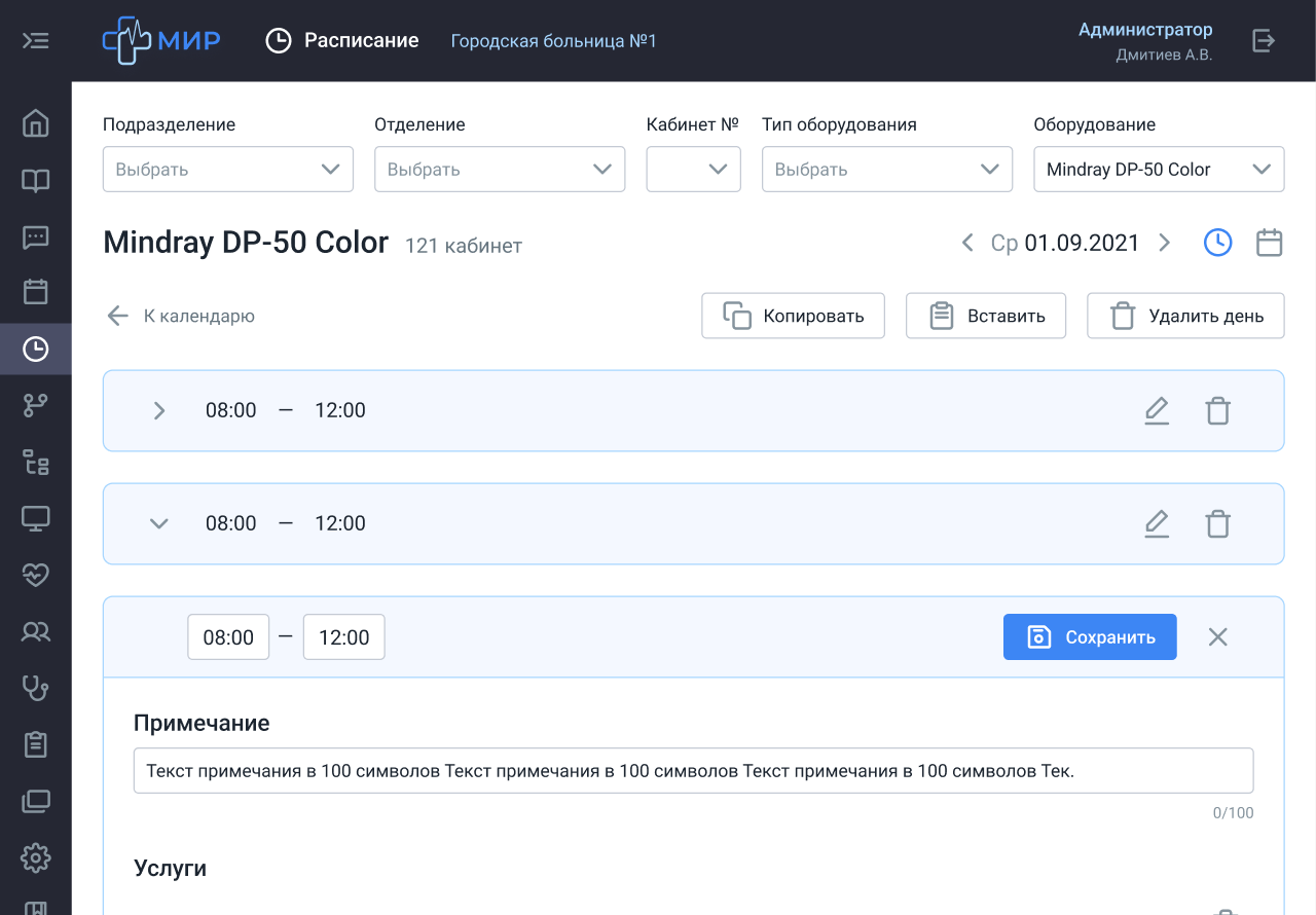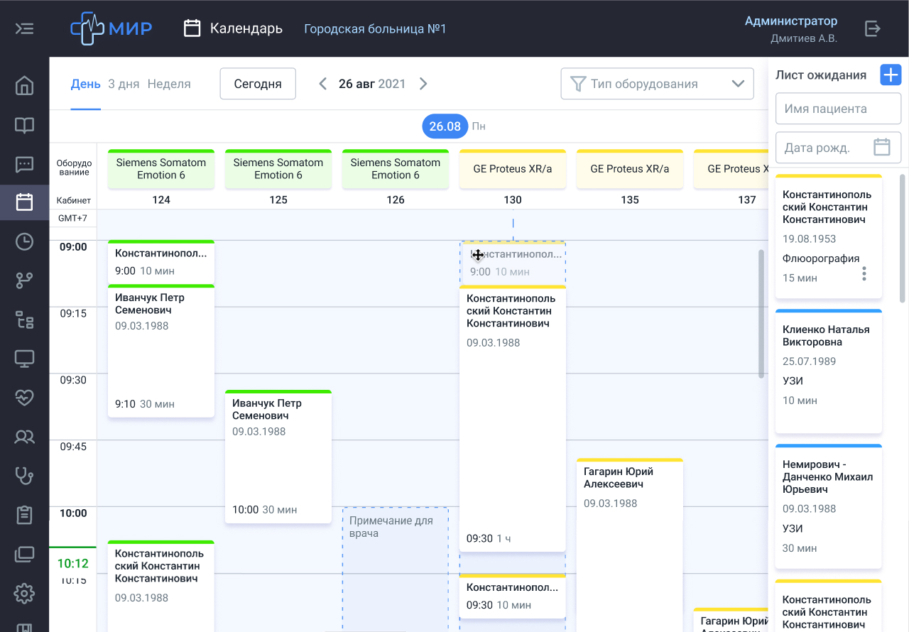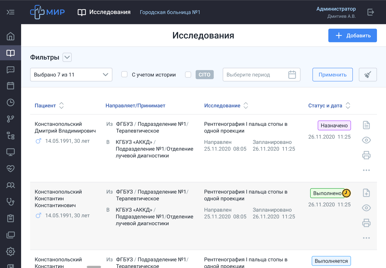 В этом разделе удобно назначить исследование на конкретное оборудование в конкретное время.