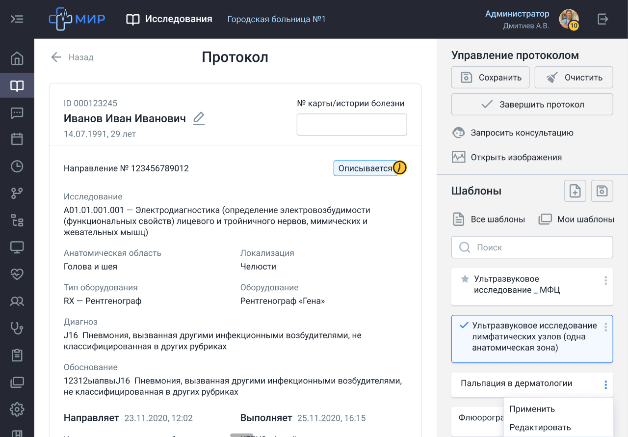 Врач может заполнить протокол вручную или заранее созданным шаблоном. Есть возможность запросить консультацию и проконсультировать. Отсюда можно перейти в архив медицинских изображений и посмотреть снимки исследования.