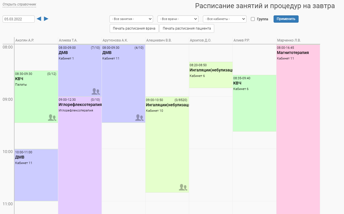 Создание расписания занятий по лечебной физической культуре, по физиотерапевтическим процедурам. Занятия можно сделать групповыми или индивидуальными с привязкой ко времени, месту проведения и врачу/тренеру.